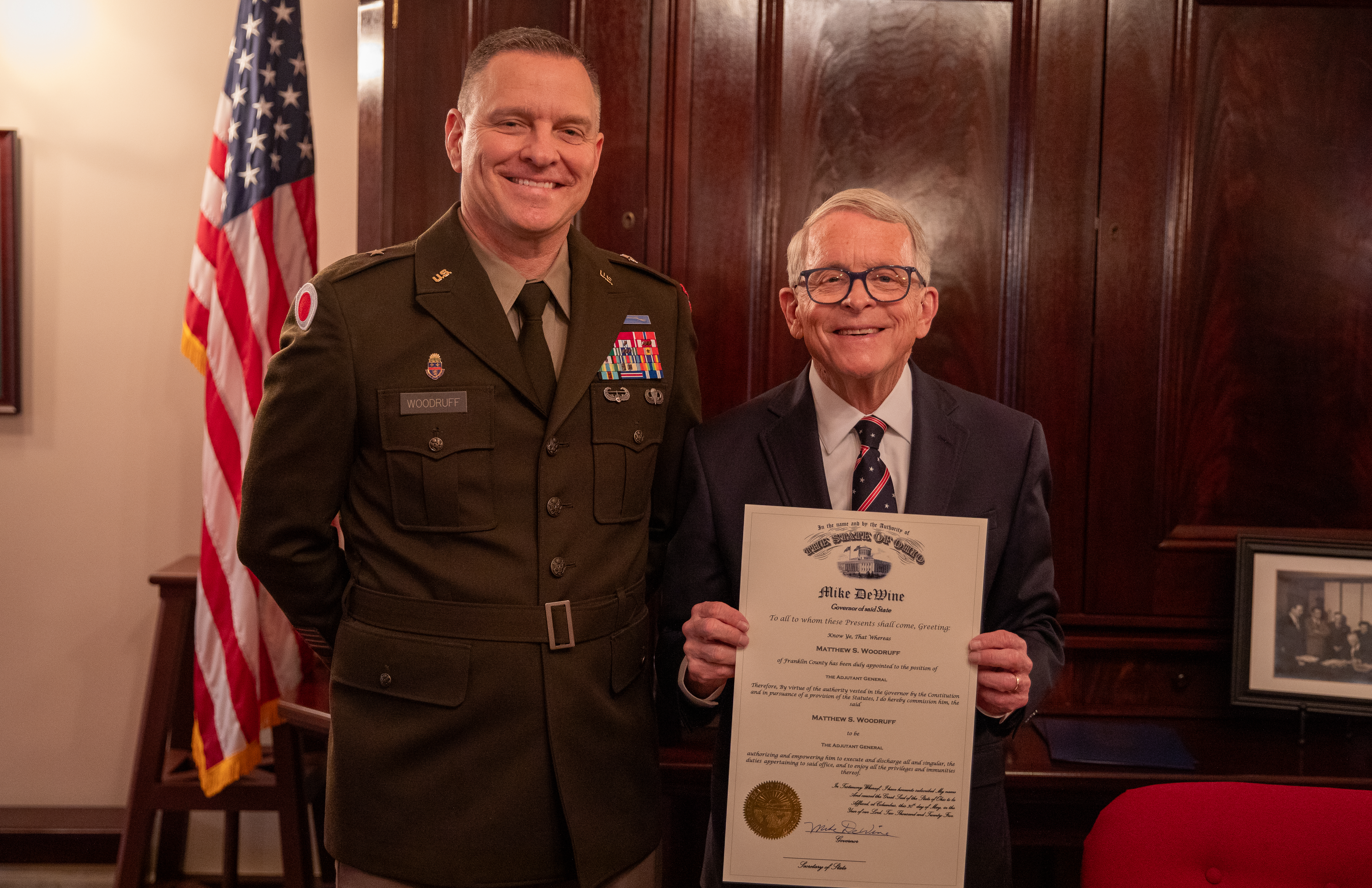 Brig. Gen. Matthew S. Woodruff, incoming Ohio adjutant general, and Ohio Gov. Mike DeWine pose for a photo with the document appointing Woodruff as adjutant general before a ceremony at the Ohio Statehouse in Columbus, Ohio, May 30, 2025. Woodruff, the 84th Ohio adjutant general, previously served as the assistant adjutant general for Army. (U.S. Army National Guard photo by Sgt. Olivia Lauer, Ohio National Guard Public Affairs)
