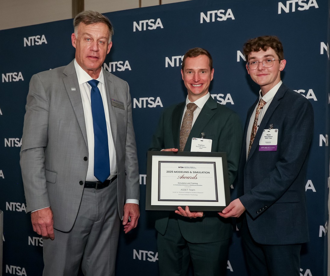 The ASSET team received this year’s Training and Simulation Team Award from the National Training & Simulation Association at the Interservice/Industry Training, Simulation and Education Conference on Dec. 2, 2025. Pictured are (Left) RADM Sean Buck, USN (Ret), President of NTSA (Middle) Stephen Hinton, ASSET team lead, (Right) Myles Weaver, ASSET developer. (Photo by EPNAC)